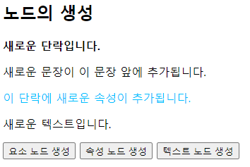 | createTextNode() | 새로운 텍스트 노드를 만들 수 있습니다. |