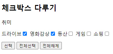 <label>영화감상<input type="checkbox" name="hobby" value="영화감상"></label>