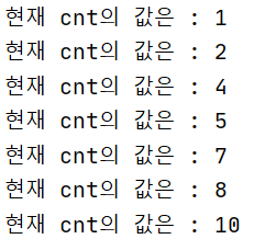 ★ 해당 cnt의 결과 값을 보듯이 문장은 반복을 하며 조건이 맞지 않을 경우, 문장을 빠져나가는 것일 뿐 cnt++는 덧셈을 진행하기 때문에 6이된다.