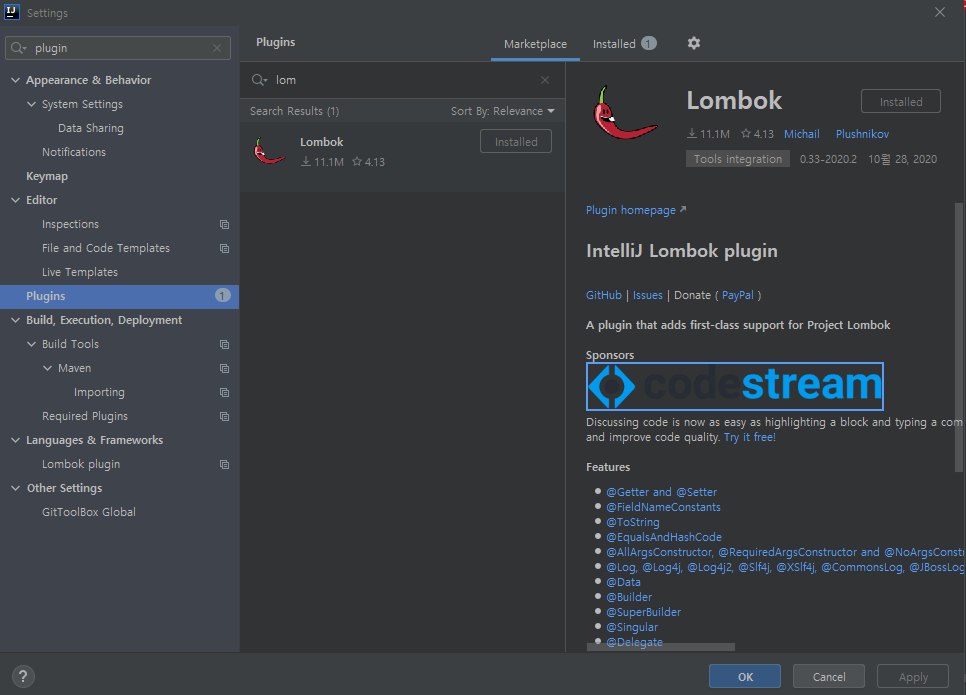 file -> setting -> plugins -> Market place에서 lombok 검색 후 설치 -> 설치 완료 후 restart