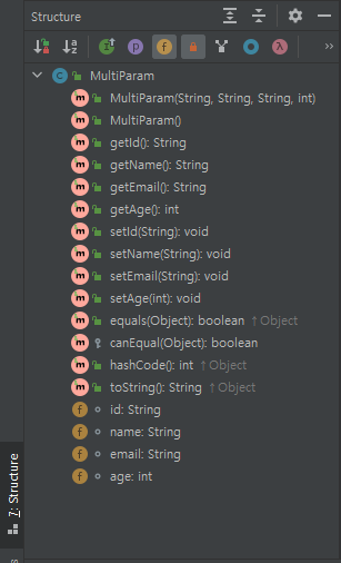 생성자와 get, set 메소드를 모두 간단하게 생성해주는 기능을 사용합니다.