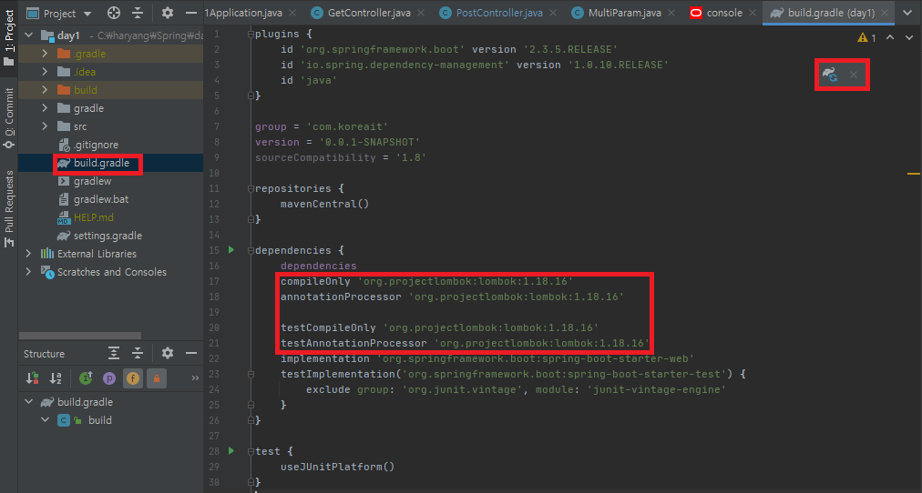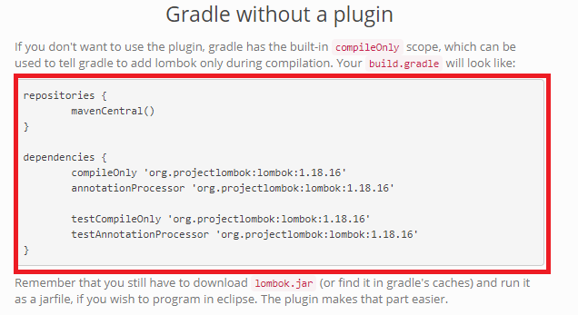 projectlombok.org/setup/gradle 사이트 -> 네모칸 복사 -> gradle 내용 넣은 후 -> 적용 버튼 클릭
