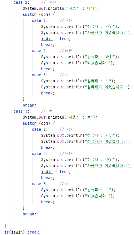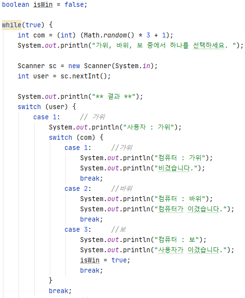 6. 사용자가 이긴경우 실행이 종료되길 원한다면 현재 switch로 break를 썼기 때문에 while에서는 별도로 boolean 변수를 지정해서 이길경우에만 빠져 나올수 있도록 지정해준다.