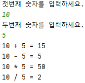 두 수를 입력받아 사칙연산을 하는 프로그램을 작성.