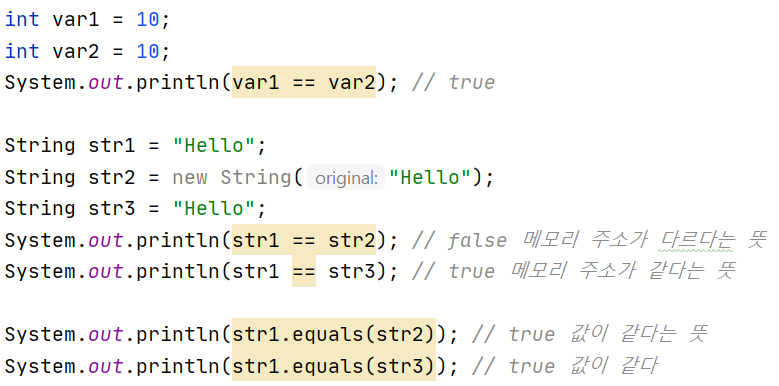 * 따라서, str 비교는 번지를 저장 ---> hello 주소 힙 저장 / 형식이 다르면 다른 주소로 저장한다.