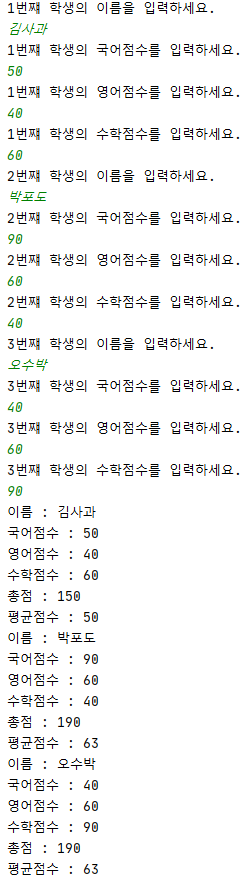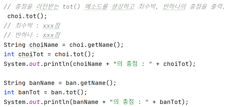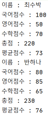 Student 클래스를 이용하여 Choi, Ban 객체를 만들어 입력한 점수에 따른 총점과 평균을 구하는 프로그램을 작성