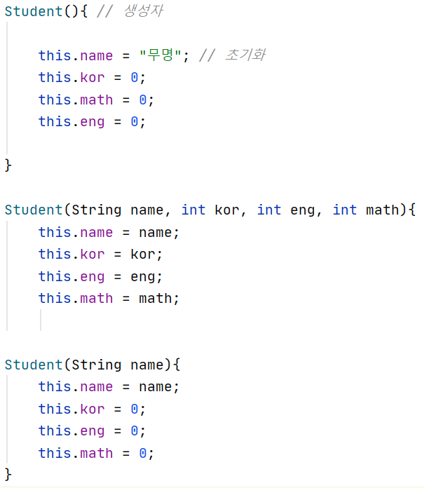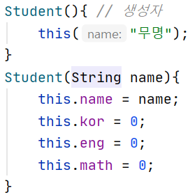 ● 생성자 소괄호에 데이터 타입이 없는 경우, 초기화시켜줍니다.