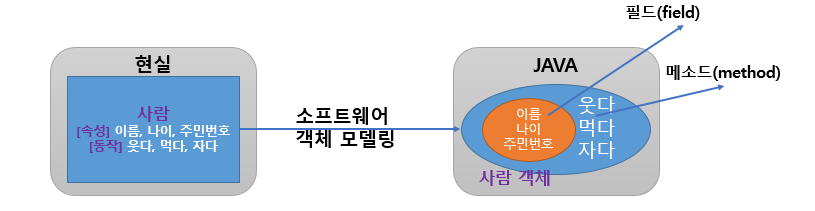실제 세계를 모델링하여 소프트웨어를 개발하는 방법입니다. 데이터와 절차를 하나의 덩어리로 묶어서 생각합니다.
