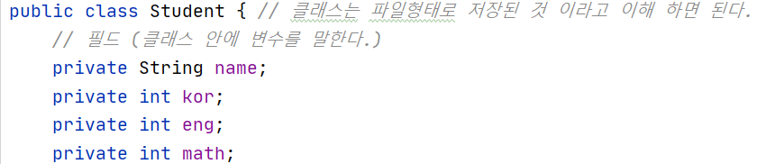 ● stack에 stu라는 변수가 만들어지고 heap에 이름 국어 영어 수학 점수를 저장할 수 있는 객체를 만들어 놓고 번지수를 저장하게 되고 stu는 번지수를 저장하고 가리키는 리모컨 역할을 한다.