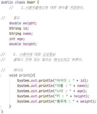 변수, 메소드의 집합입니다. 동일한 속성과 행위를 수행할 수 있는 객체를 만듭니다.