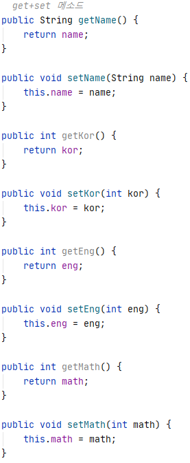 ● private으로 필드 값 수정이 메인에서는 확인되지 않아 접근할 수 있게 get(값을 가져오다) + set(값을 세팅하다) 메서드를 생성해주는 것이다.
