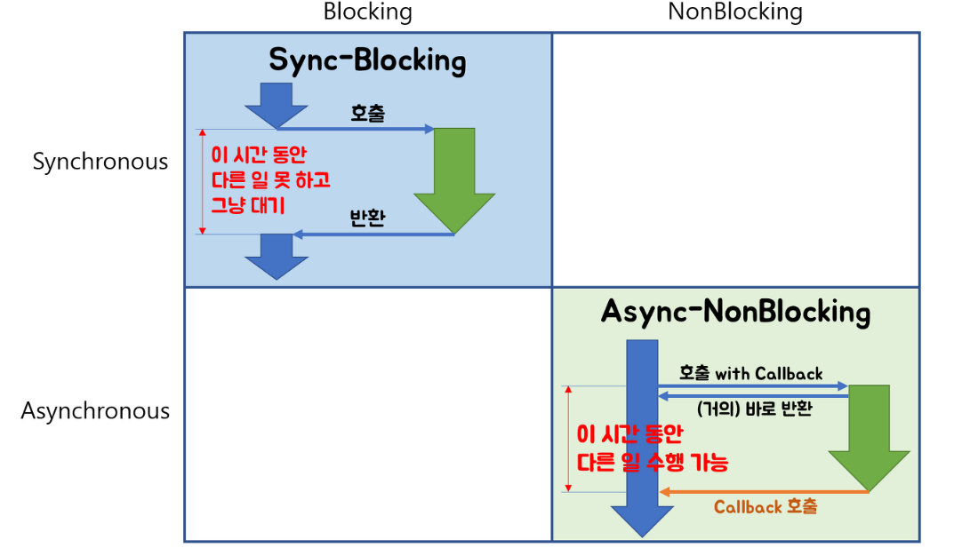 - 제어권이 계속 호출한 함수에 있기 때문에 작업의 완료여부와 관계없이 새로운 작업을 수행할 수 있다.