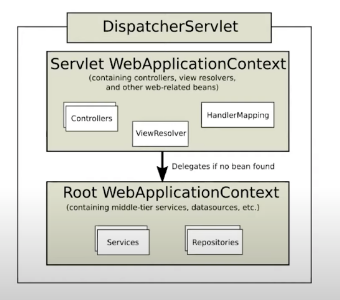 서블릿 웹 애플리케이션 컨텍스트는 웹 요청 처리 관련 객체들이 담겨있고, 루트 웹 애플리케이션 컨텍스트 안에는 웹 요청처리와 관련된 빈 외의 나머지 컴포넌트들(서비스, 레포지토리 관렬 객체들)이 관리 됩니다.