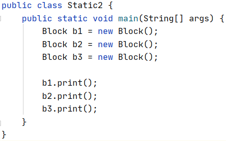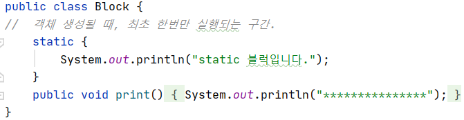 ● Block class 에서 static 객체가 생성될 때 단, 한 번만 실행되는 구간을 의미합니다.