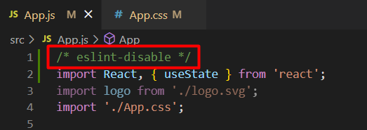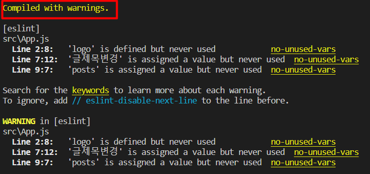 warning을 보고 싶지 않다면, /* eslint-disable */ 작성하기
