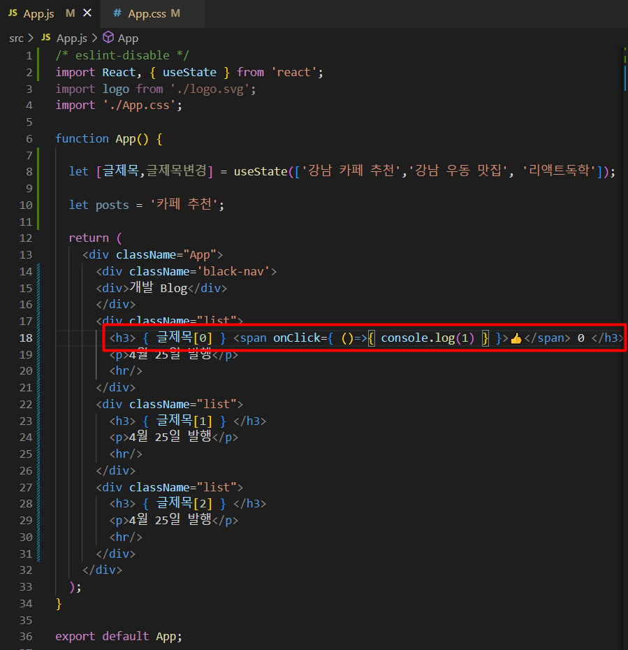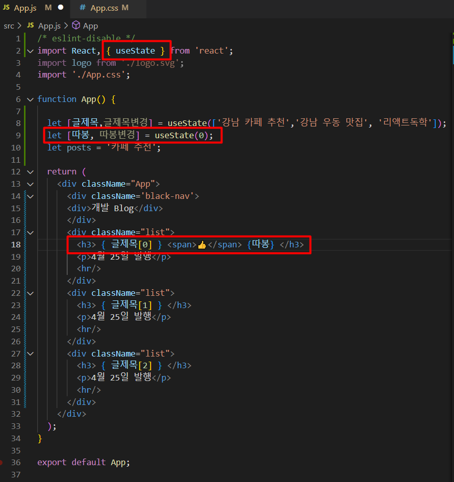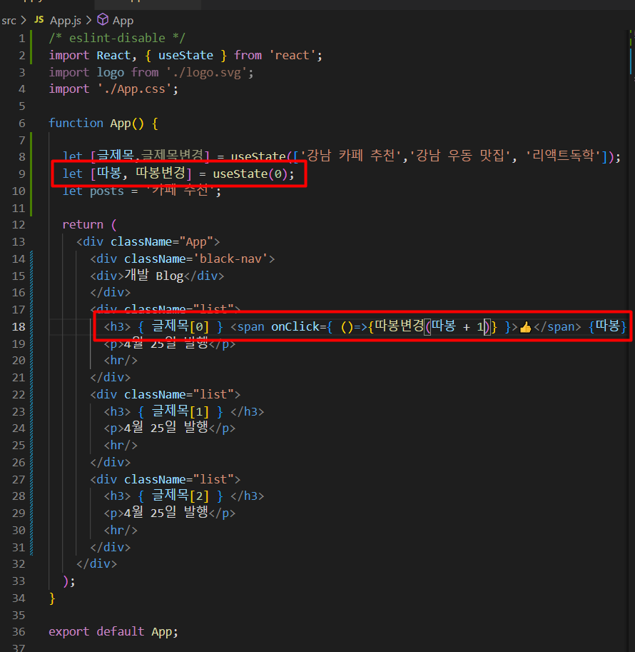 따봉은 자주 변하는 숫자이므로 useState로 만들어야 한다.