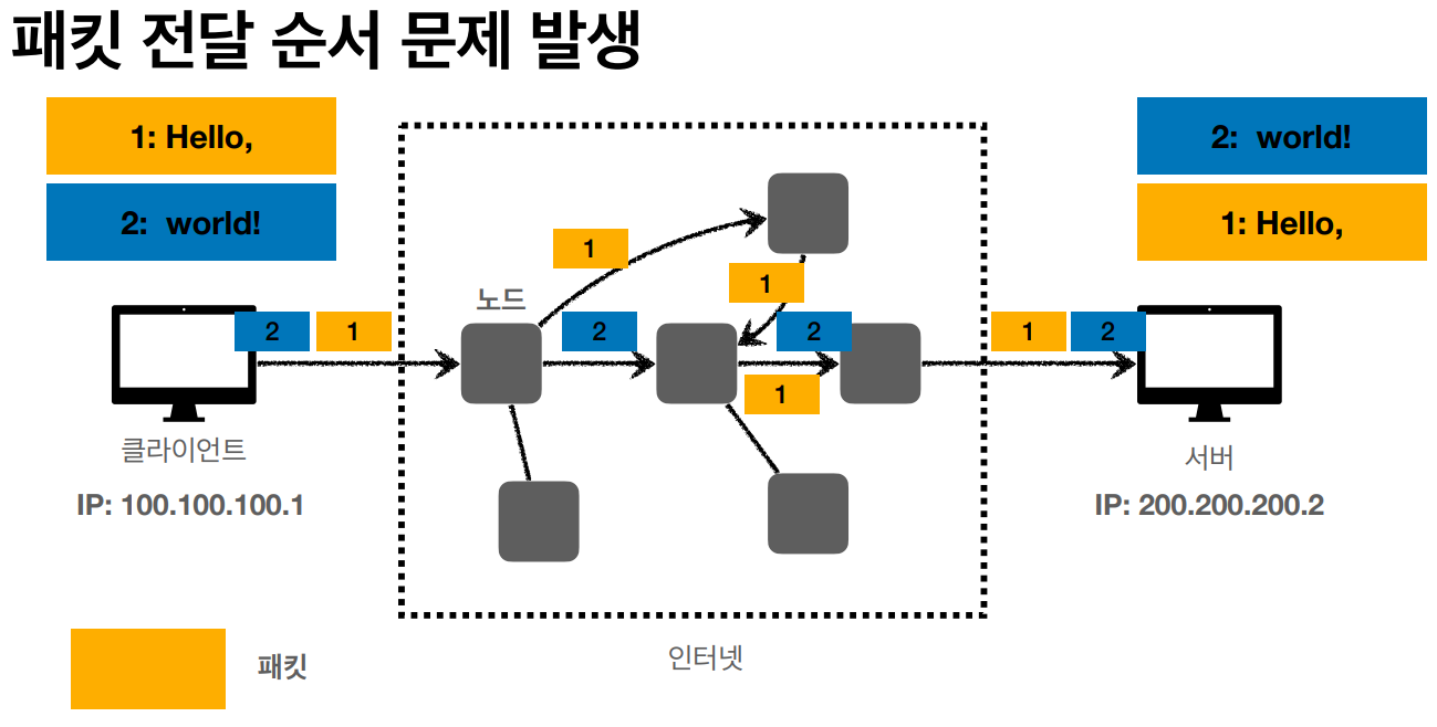 👉 패킷의 용량이 클 경우, 나눠서 보내게 된다. 그러나, 패킷들이 중간에 내부 상태에 따라 각각 다른 노드로 이동할 수 있기 때문에 패킷 순서가 다르게 전달 될 수 있다.