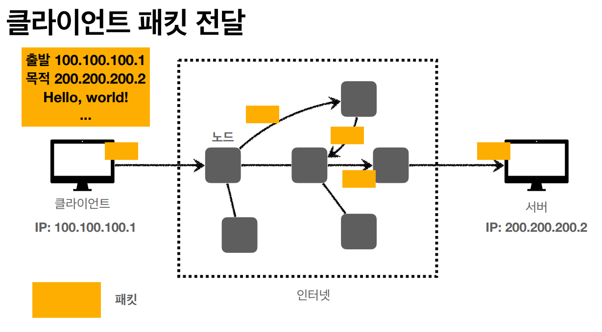 전송데이터(message)와 함께 출발지 IP(client), 목적지 IP(server) 등을 패킷으로 묶어 전달한다.