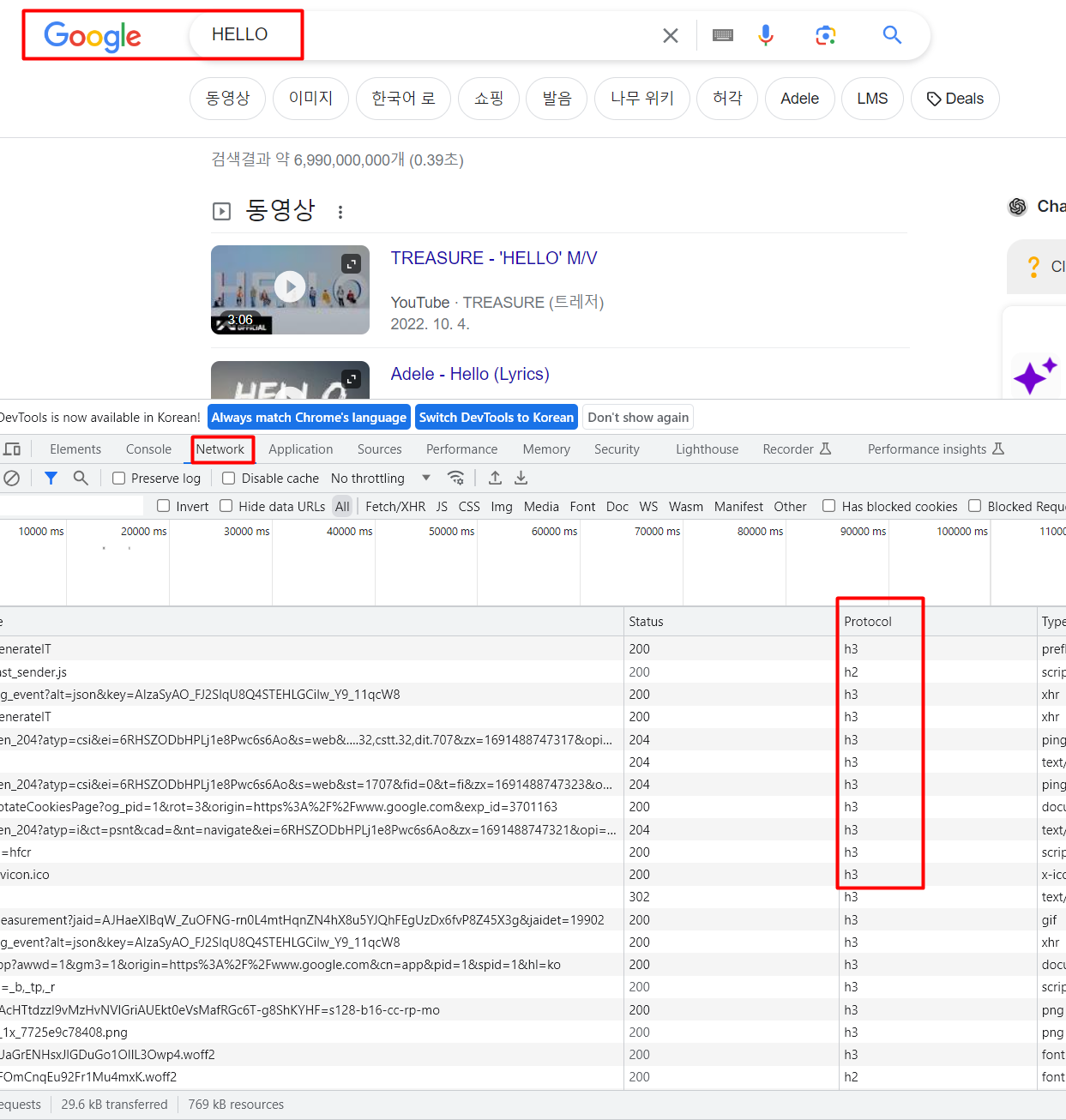 구글 검색 후 F12 -> Network -> protocol 을 보면 실제 사용되는 HTTP 버전 확인이 가능하다