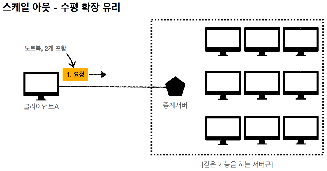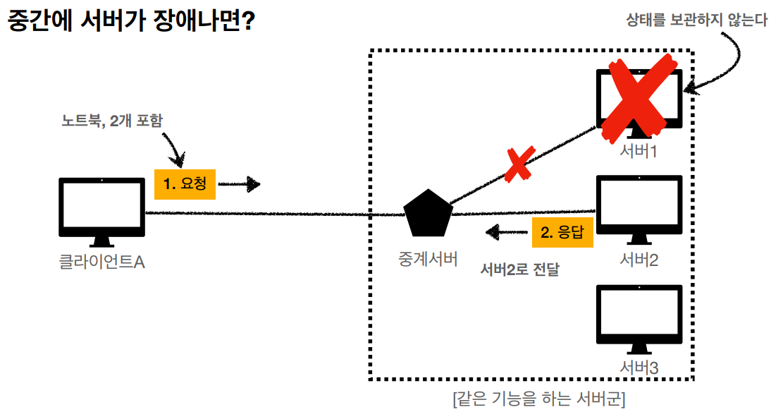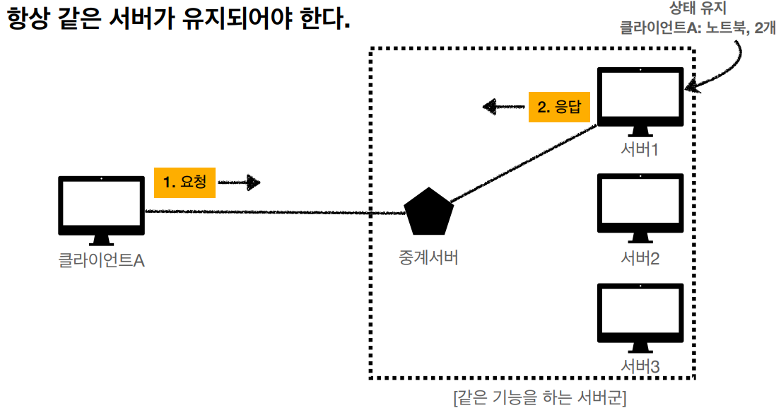 서버1은 클라이언트A가 요청한 노트북, 2개라는 상태를 모두 유지하고 있는 상태가 된다. ( 서버 증식이 어려움 )