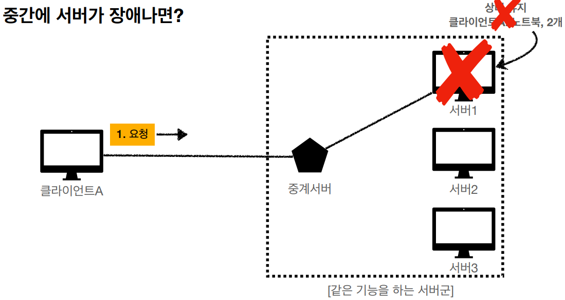 서버1이 장애가 발생하면, 클라이언트A는 중개 서버가 서버2번으로 요청한다.