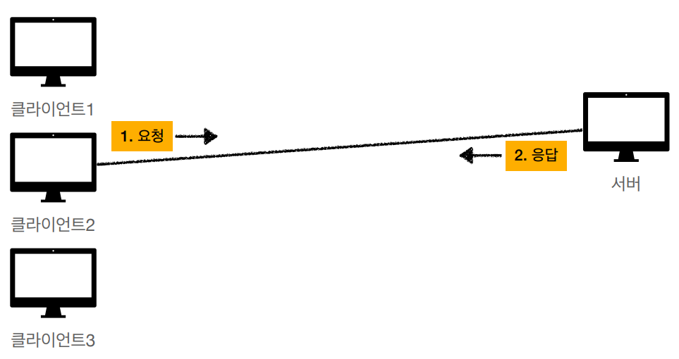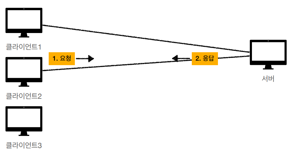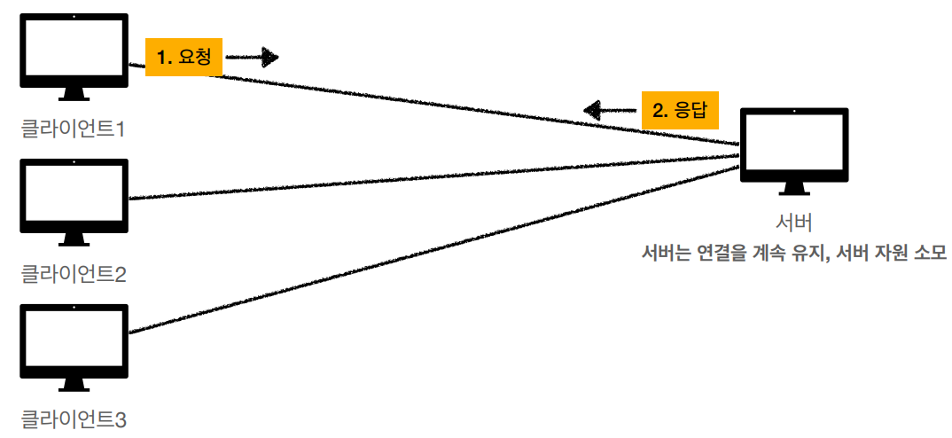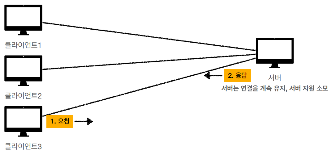 ✔ 클라이언트1과 클라이언트2는 서버와 연결을 계속 유지하며, 서버 자원을 소모한다.