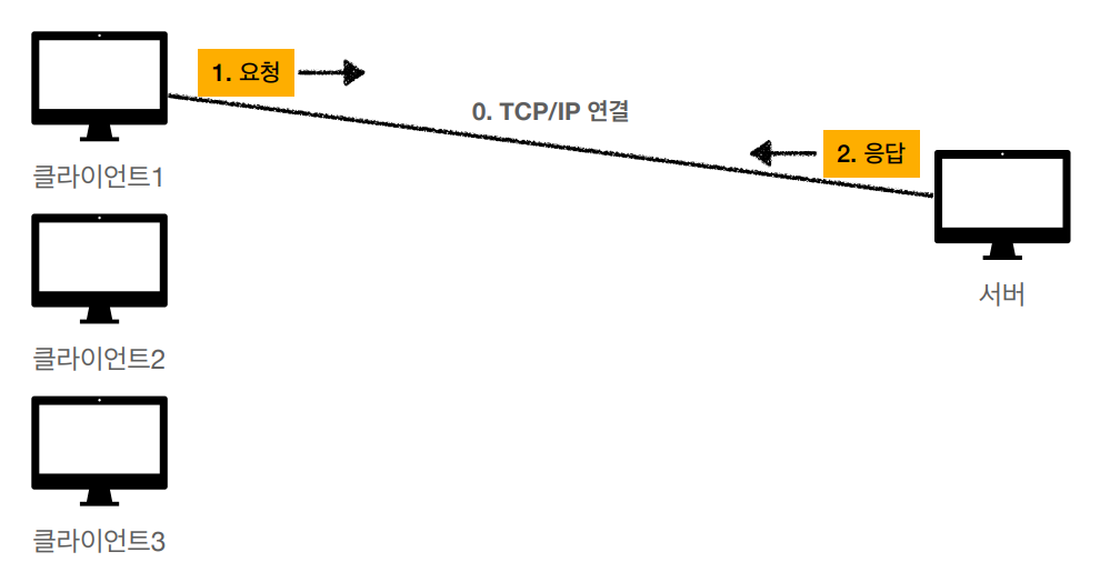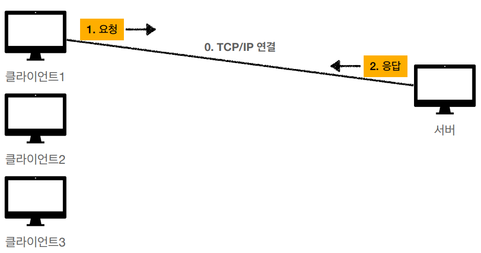 ✔ 클라이언트1와 서버가 연결 후, 요청과 응답을 주고 받는다. 클라이언트1은 서버와 연결 유지된 상태