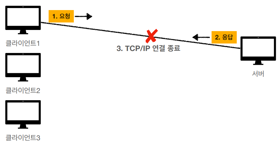 ✔ 클라이언트3와 서버가 연결 후, 요청과 응답을 주고 받은 후, 서버와 연결을 종료한다.