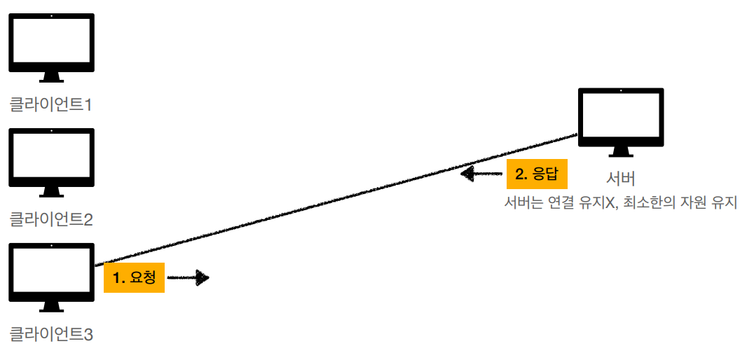 - Connectionless : TCP/IP 커넥션 연결을 지속하지 않는다