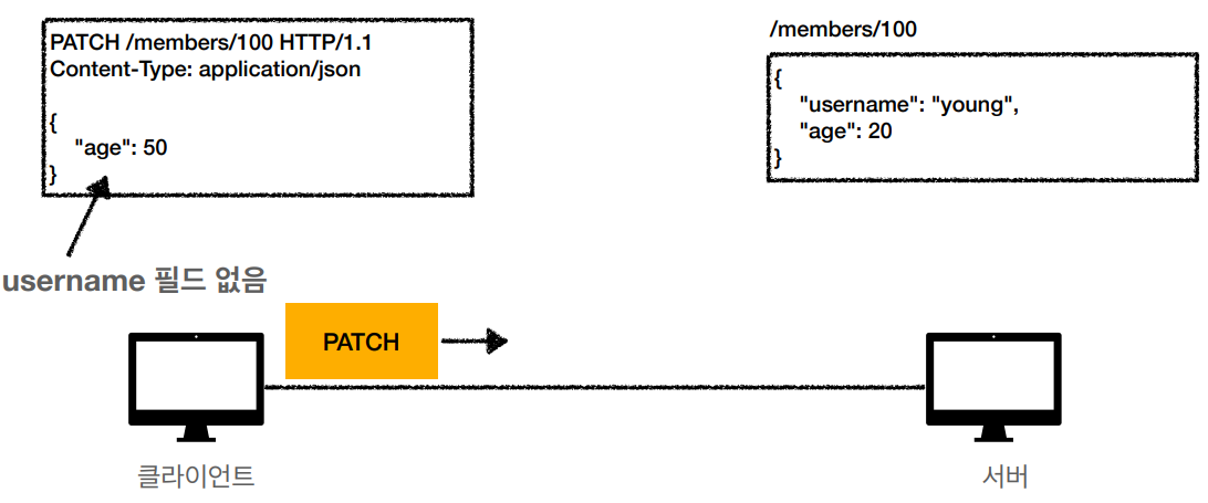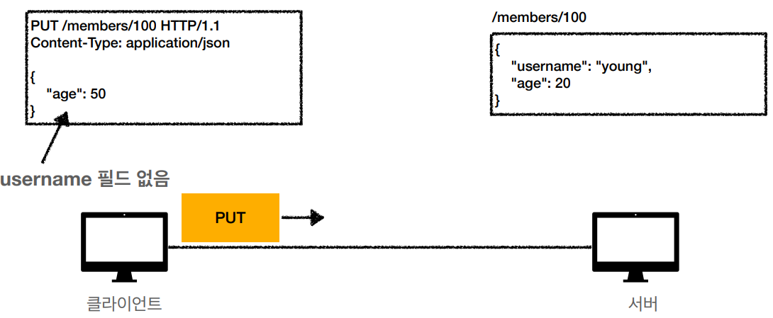- 클라이언트에서 /members/100 리소스에서 나이만 변경하여 서버에 데이터를 보낸다.