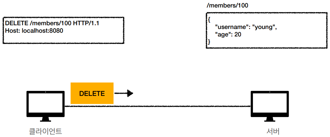 - 클라이언트에서 /members/100 리소스를 서버에 보낸다.
