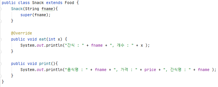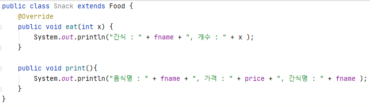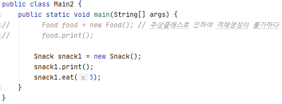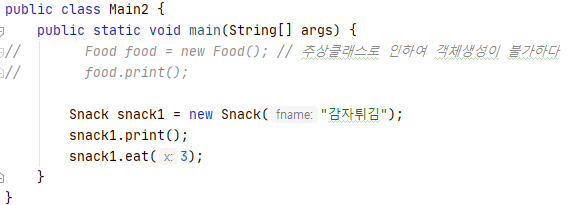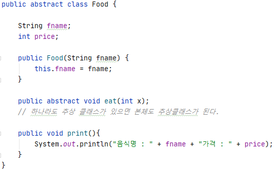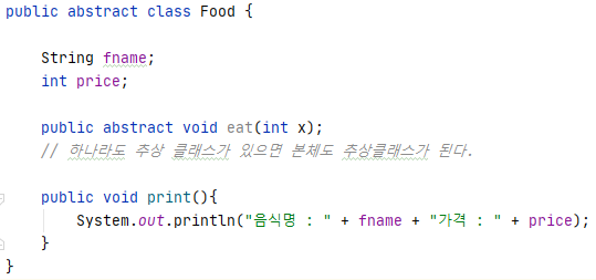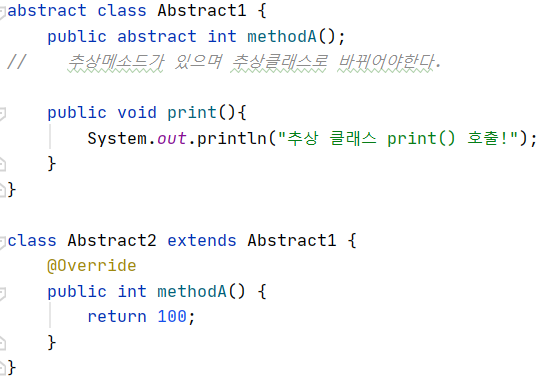 추상메소드가 있으면 추상클래스로 바꿔줘야한다. 추상 메소드라는 것은 하위 클래스에서 반드시 오버라이드 해야하는 메소드 입니다.