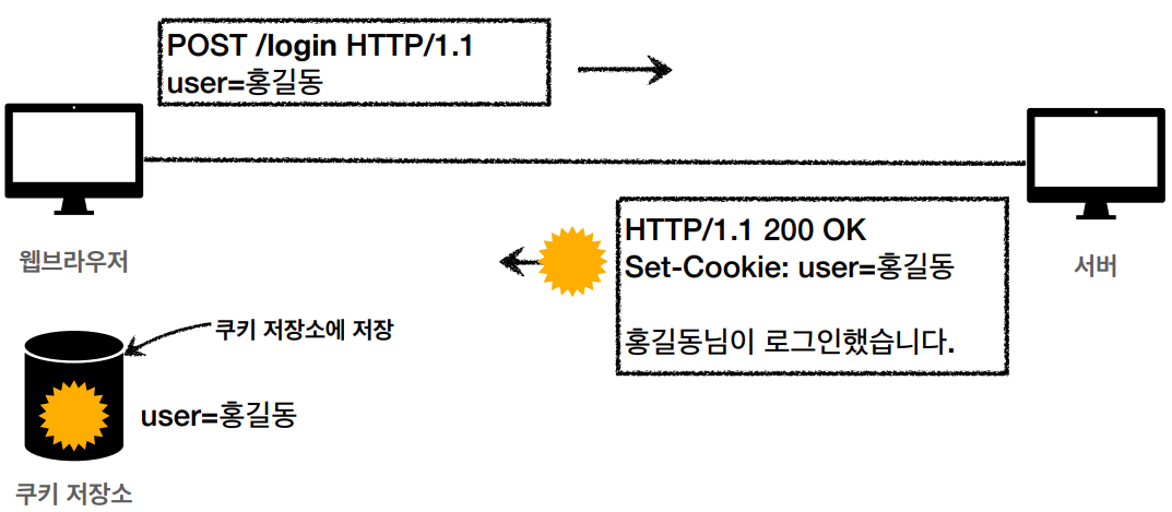 - 웹브라우저에서 POST user 정보를 담아 서버에 요청을 하면, 서버는 Set-Cookie에 유저 정보를 담아 응답한다.