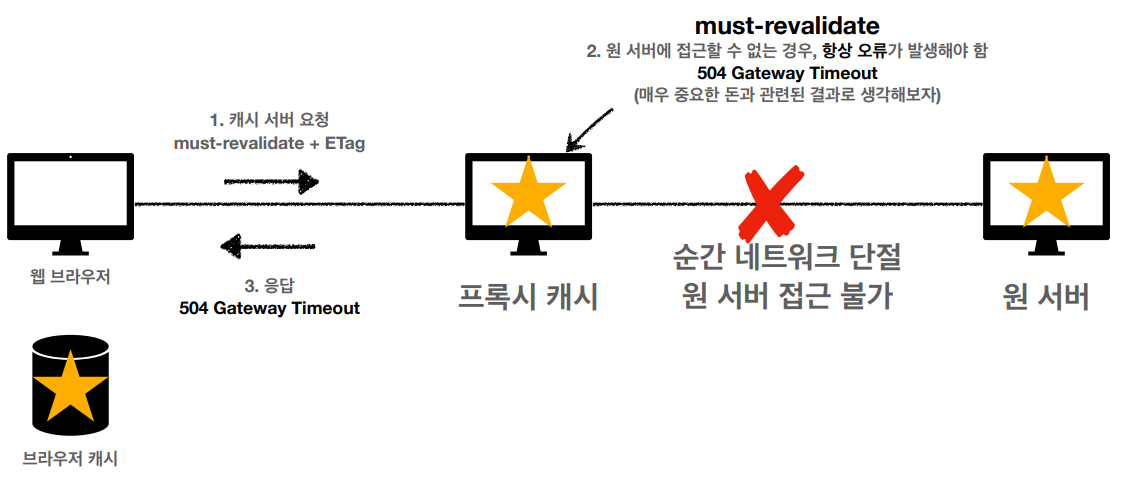 1) 캐시 서버 요청 must-revalidate를 프록시 캐시로 보낸다.