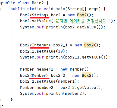 ● 제네릭 클래스를 생성할 때 사용할 실제 타입을 명시하면, 내부적으로는 정의된 타입 변수가 명시된 실제 타입으로 변환되어 처리됩니다.