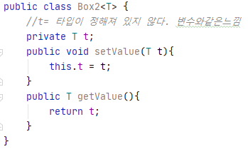 예제에서 사용된 'T'를 타입 변수(type variable)라고 하며, 임의의 참조형 타입을 의미합니다.