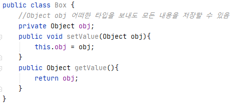 - Object obj 어떠한 타입을 보내도 모든 내용을 저장할 수 있음