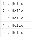 console.log(`${i} : Hello`);