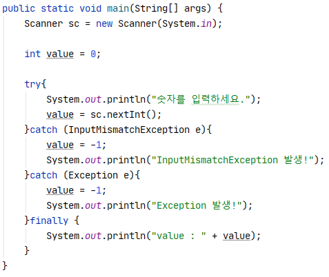 예) 배열 범위 벗어난 경우, null 참조 변수 호출, 잘못된 형변환, 잘못된 수식계산..