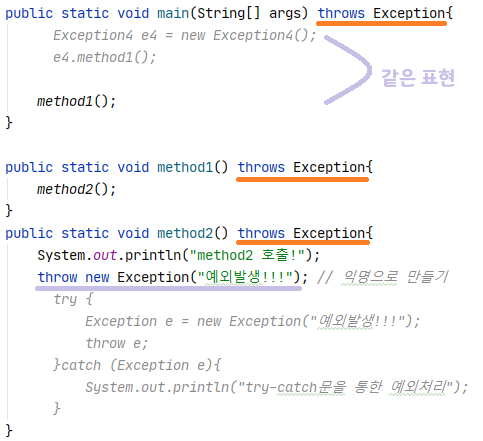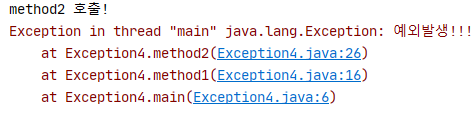 예시 3) throws 키워드를 사용하여 호출된 메소드에서 발생한 예외를 호출한 메소드로 넘기는 경우