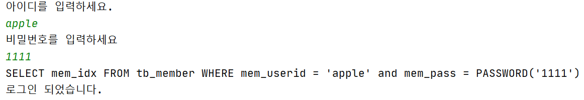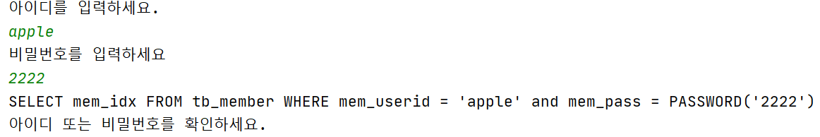 String sql = "SELECT mem_idx FROM tb_member WHERE " + "mem_userid = ? and mem_pass=PASSWORD(?)";